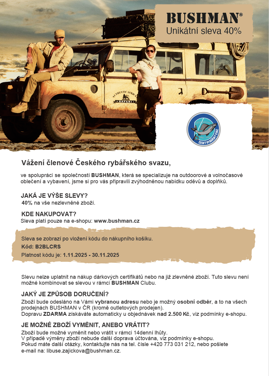 Vážené rybářky, vážení rybáři, ve spolupráci s firmou Bushman jsme pro všechny naše členy opět připravili 40% slevu na výrobky této české společnosti. Podrobnosti naleznete níže.