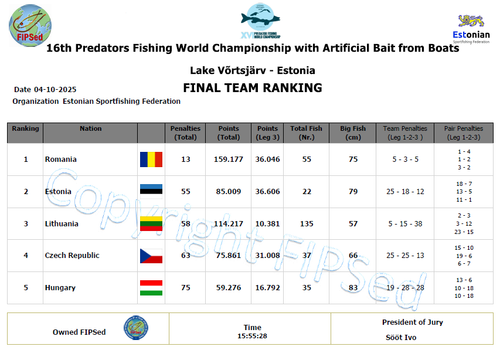 Bodovací limity byly nastaveny tak, že do výsledků se započítávala štika od 50 cm, candát od 51 cm a okoun od 23 cm. Candáty se nakonec podařilo systematicky lovit pouze domácímu estonskému týmu, který znal specifika jezera nejlépe. Lov navíc komplikoval silný vítr a velké vlny, což činilo závod fyzicky velmi náročným.