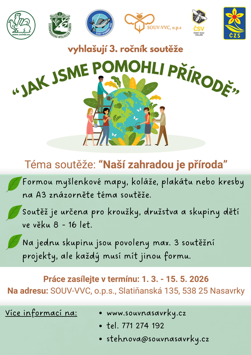 SOUV Nasavrky společně s partnerskými organizacemi včetně ČRS vyhlašuje 3. ročník soutěže „Jak jsme pomohli přírodě“, která je určena pro dětské kolektivy se zájmem o ochranu přírody a krajiny.